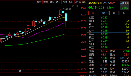 但是,豪迈科技今日股价收跌,成交量也明显放大。二级市场显示,今日下午A股开盘后,豪迈科技的股价突然下坠,随后有所回升,截至收盘,公司股价收跌3.56%,市值约481亿元。